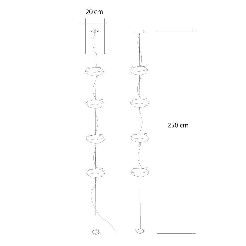 The cable is held taut by the weight of a pebble, the other winds around the cocoons. The garland is attached to the ceiling with a hook or to a box fitted with a brushed stainless steel disc.