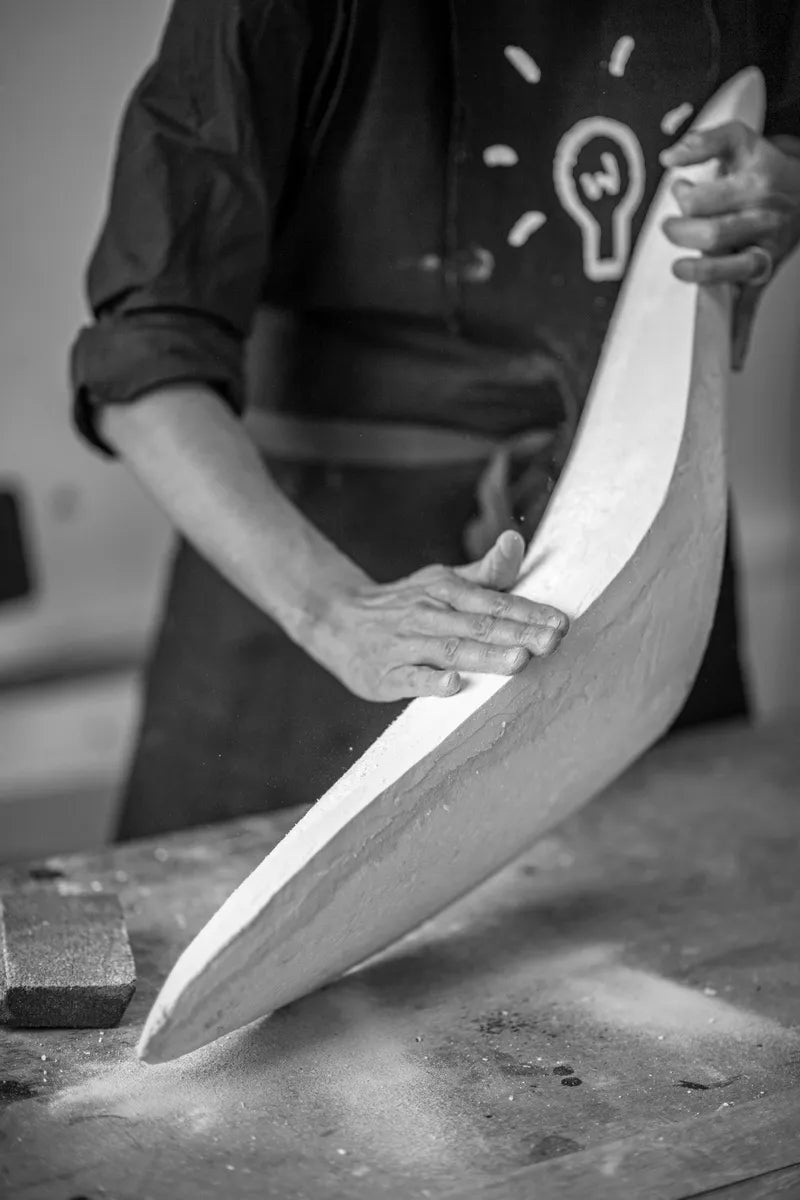 Tout commence par la création d'une forme en terre ou en argile préalablement dessinée par Céline Wright, puis modelée entre ses mains. Ce moule -ici l'Oiseau- servira ensuite à la production. C'est à partir de ces derniers que les abat-jours seront fabriqués à la main, la seule énergie non polluante. Nos uniques outils sont des ciseaux et des pinceaux !