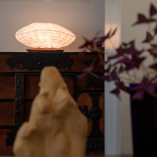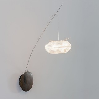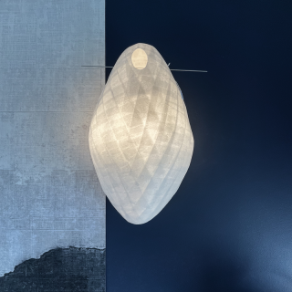 La guirlande se fixe au plafond à un crochet et se branche au niveau du sol. L’espacement des abat-jours est réglable, ils coulissent sur le câble lesté par un galet de marbre blanc.