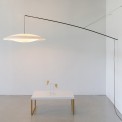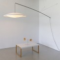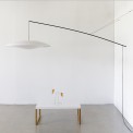 L’abat jour Diva est suspendu à une longue tige d’acier noire fixée au mur.